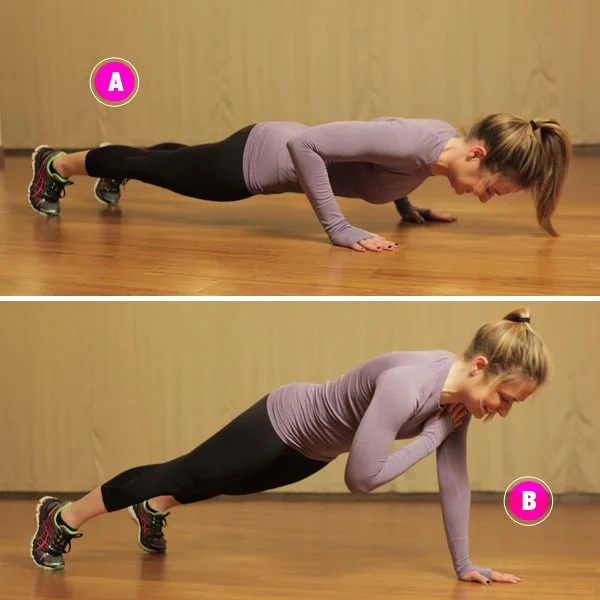 After completing one standard pushup, tap one shoulder with the opposite hand while maintaining a stable plank. Perform another pushup and tap the other shoulder with the opposite hand.